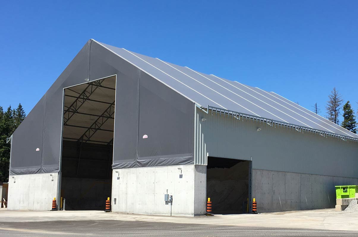 The building is able to accommodate large front loaders and plow trucks that are capable of operating simultaneously within the building. Constructed on concrete foundations with galvanized steel framing covered by a fabric roof membrane, aluminum siding was used to provide further protection to adjacent properties and buildings.