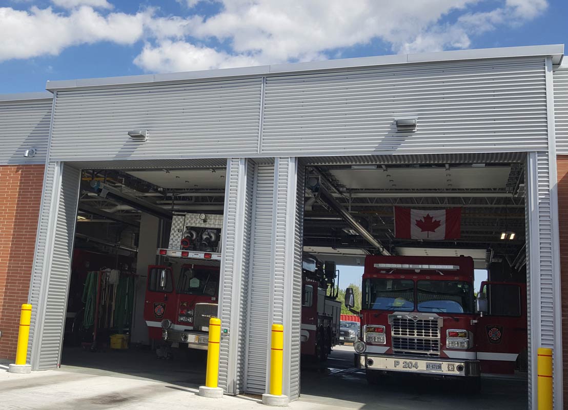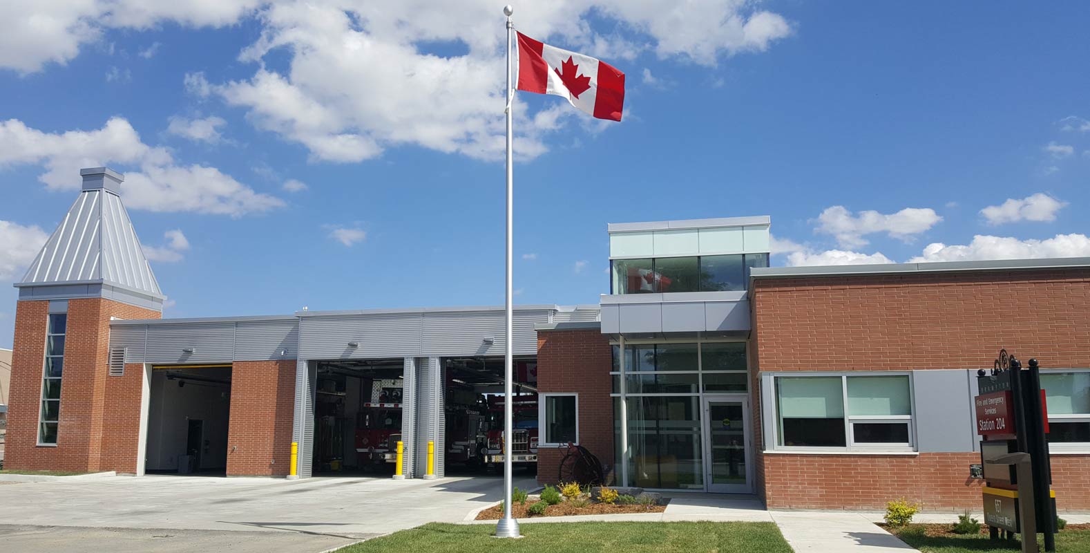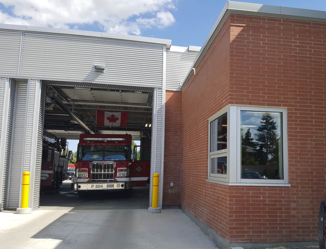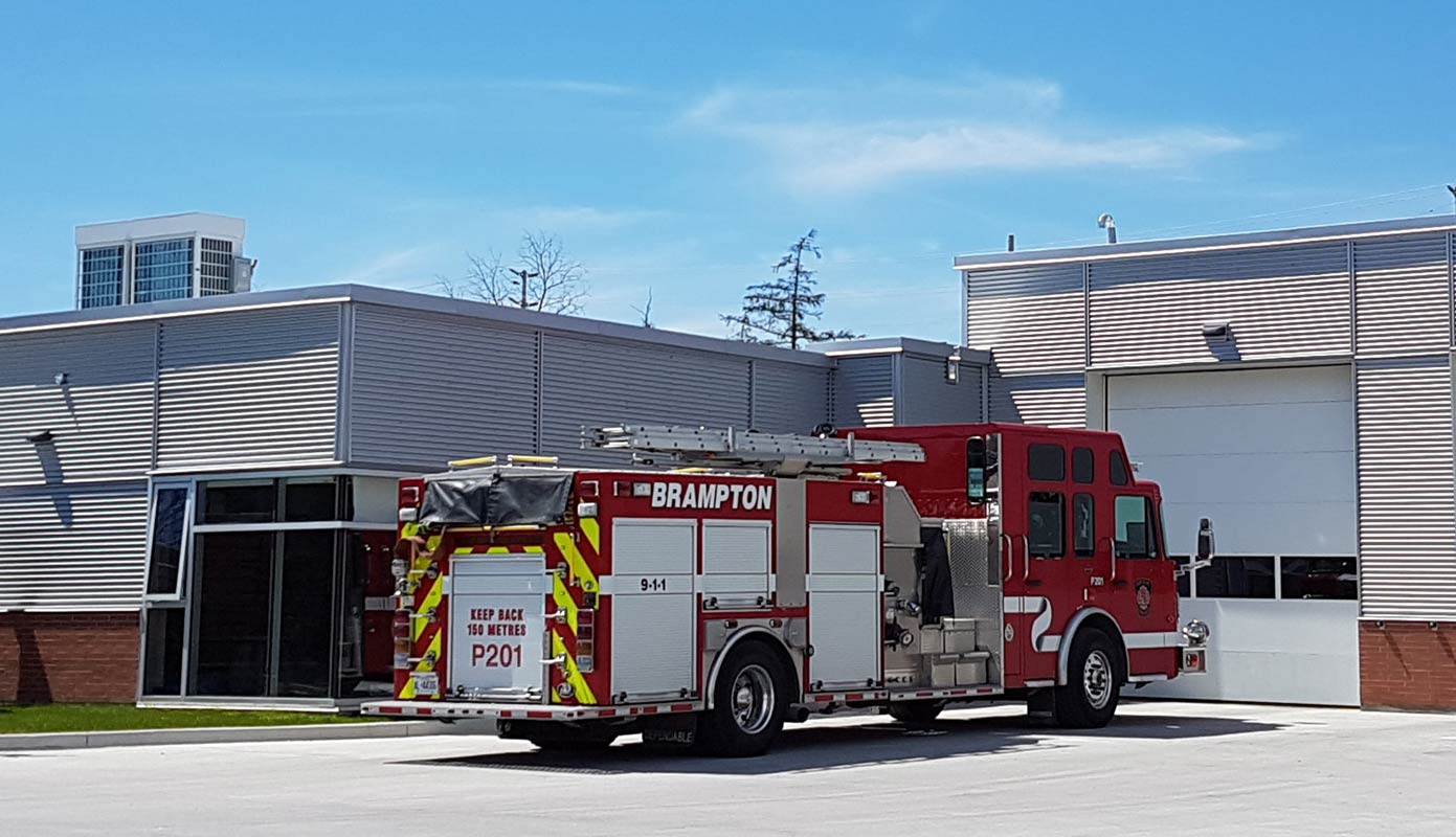 This 40 year-old fire station was rehabilitated to meet the current and future needs of a growing community. The project involved building three additions and renovating the remaining existing station. The rehabilitation updated the aging facility to meet the service capability and technical standards required by the Brampton Fire & Emergency Services (BFES) as well as the barrier-free design and energy conservation requirements of the current building code. The renovation completely renewed the dayroom, dormitory and apparatus bay and created new medical storage, a clean room, universal washroom and mechanical and electrical rooms. The additions provided new spaces for the fire suppression crew, fire prevention officers and radio communication officers, new washrooms, locker rooms, fitness room, bunker gear storage, outdoor storage apparatus bay and hose tower. The existing apparatus bays were converted into drive-thru bays to match the new apparatus bay. The two and a half acre site was re-designed to accommodate the expanded building and parking lot, new garbage bin enclosure, emergency generator and outdoor patio. The size and dimensions of the paved area were governed by the space required for maneuvering the firefighting vehicles and garbage truck. A new driveway was added allowing fire trucks to drive-through the apparatus bays.