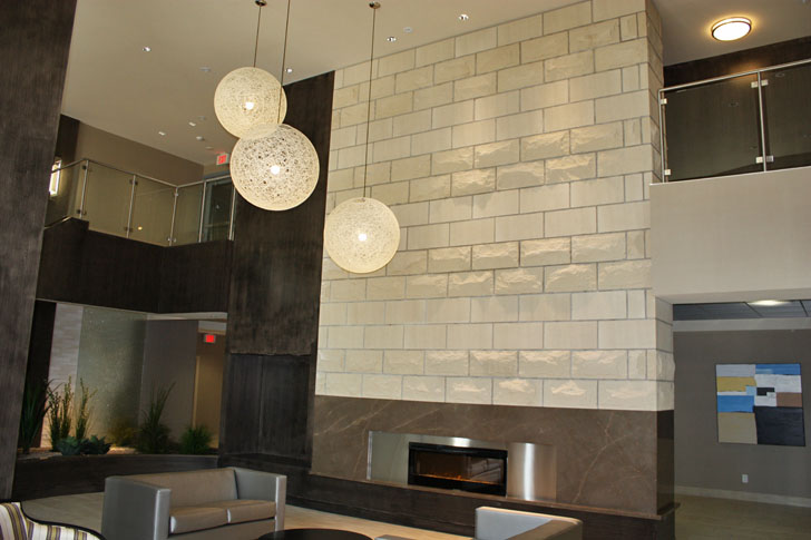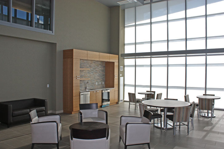 Strata features a two storey lobby with a waterfall feature, sitting area, controlled entry and access to other amenities including a business centre, café, lounge, and party room. The common area makes up 5,600 sq. ft., with living plants and Zen stone gardens providing a feeling of serenity when entering the building.