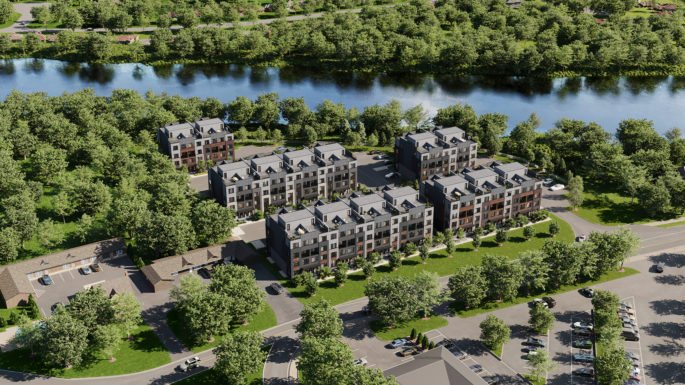 Located in Welland the development consists of 5 blocks of back to back townhomes for a total of 120 units along the picturesque Welland River. The towns are designed in a contemporary style featuring roof top patios looking out on to the river.
