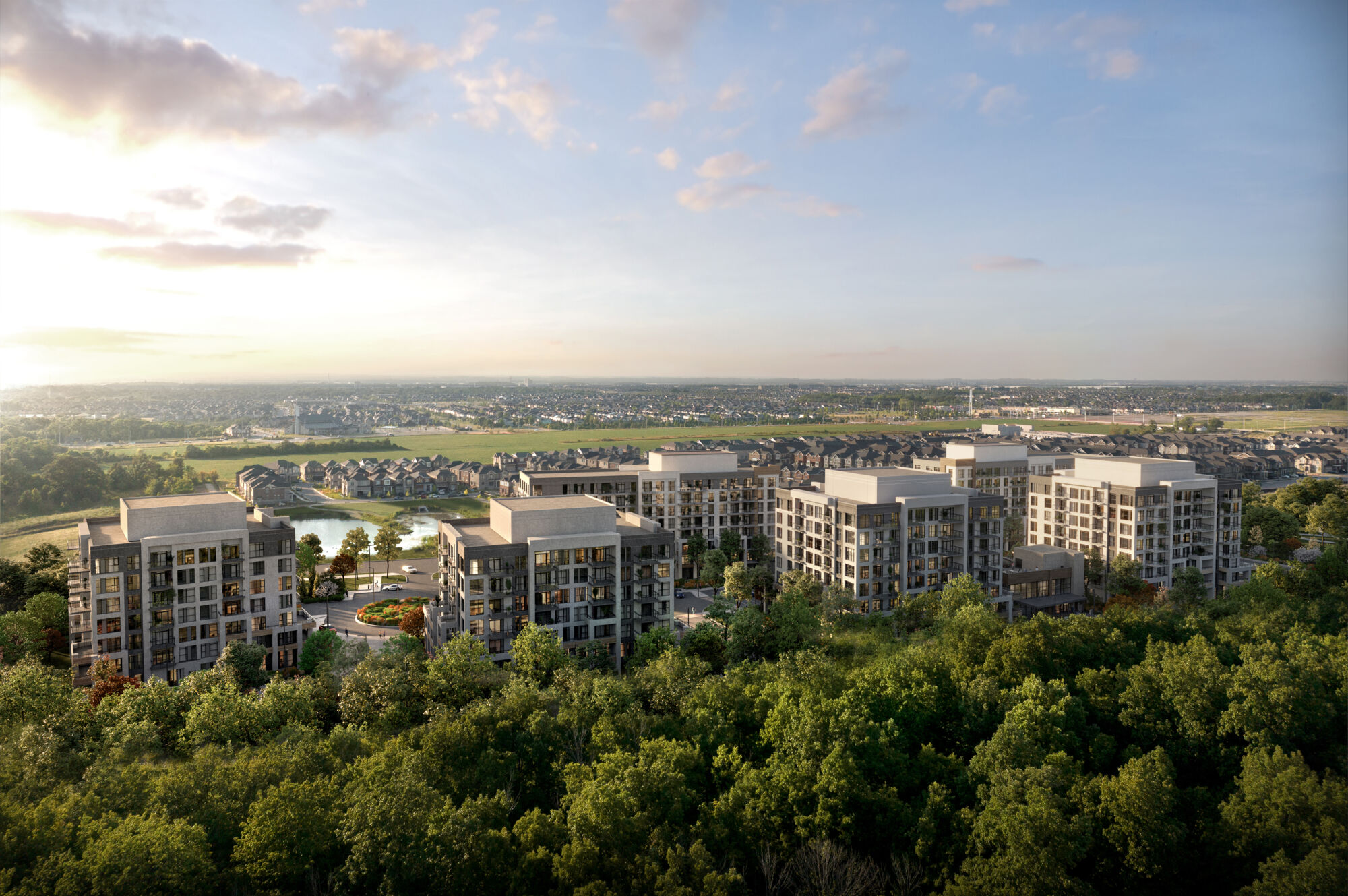 As a new residential community located within the Town Milton, “Mile & Creek” is surrounded by the Niagara Escarpment, naturalized green space, parks and trails. Thoughtful massing emphasizes these peaceful surroundings while the use of a natural colour pallet and wood patterns brings warmth to the design. Keeping sustainability in mind, a geothermal system will be incorporated to heat and cool this three-phased project.